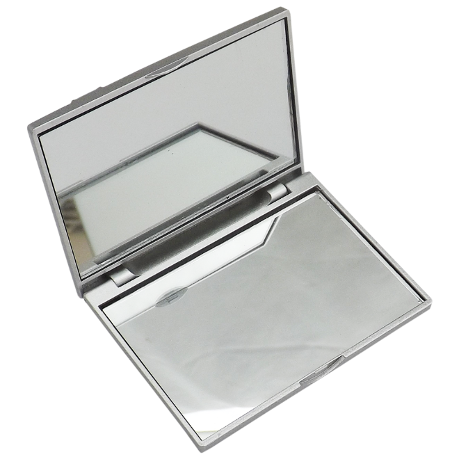 Espelho de bolso duplo, material em plástico resistente. Medidas para gravação (CxL): 5,8 cm x 3,8 cm Tamanho total (CxL): 8,3 cm x 6,1 cm Peso do produto: 63 g Quantidade de peças por caixa: 480 peças.