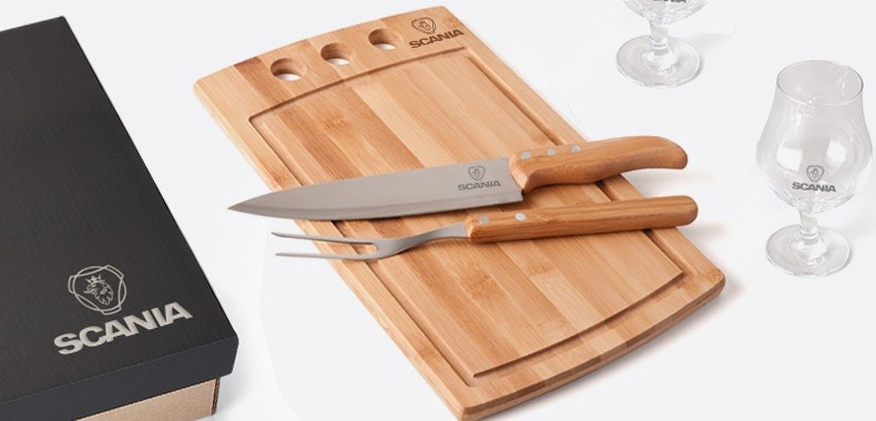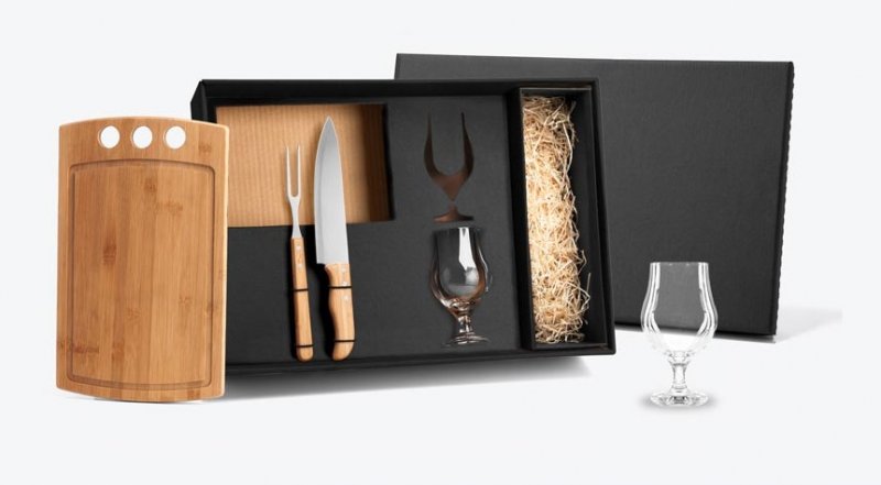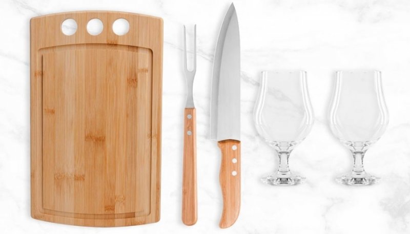 Uma gravação a Laser nas duas taças, na tábua, na lâmina da faca e na tampa da caixa.
