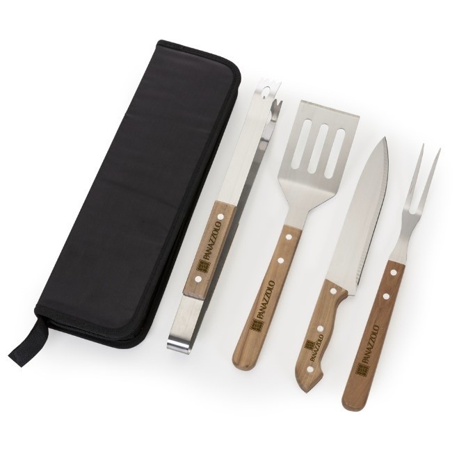 Descrição: Kit churrasco 4 peças em estojo de nylon com alça. Possui: faca e garfo de madeira(na cor preto os cabos são de plástico), acompanha proteções plásticas e parte interna com velcro para guardar as peças.