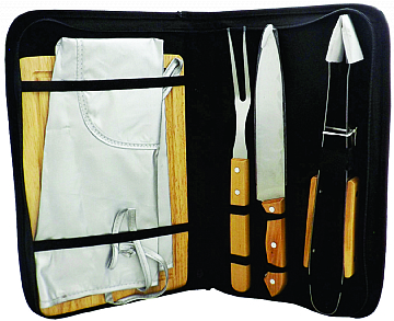 Kit Churrasco com avental e 4 peças de metal, em estojo sintético. 1 Garfo 1 Faca 1 Pegador 1 Tábua para corte Medida Total (CxL) 36.4 x 48 cm Peso total: 1.021 kg