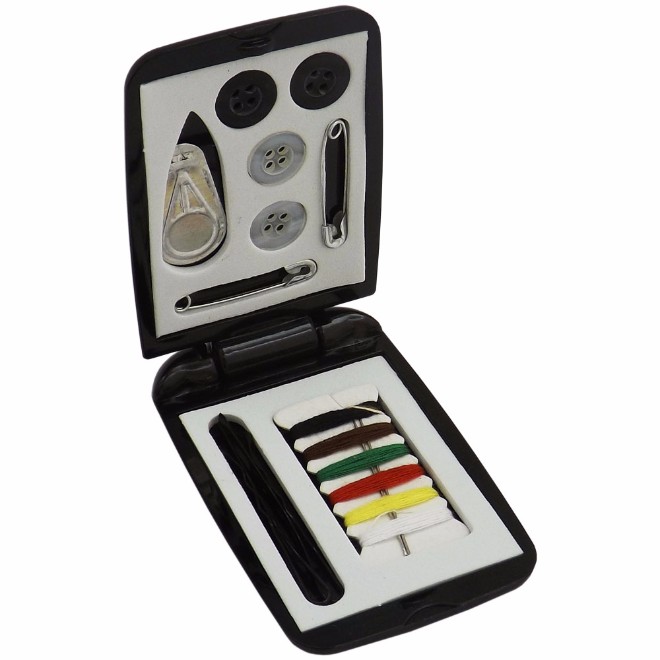 Kit costura, material em plástico resistente. Conteúdo: * 6 Linhas * 2 Alfinetes * 4 Botões * 1 Passador de linha * 2 Agulhas * 2 Grampos Tamanho total (CxLxE): 7,5 cm x 4,8 cm x 0,9 cm Peso do produto: 20 g