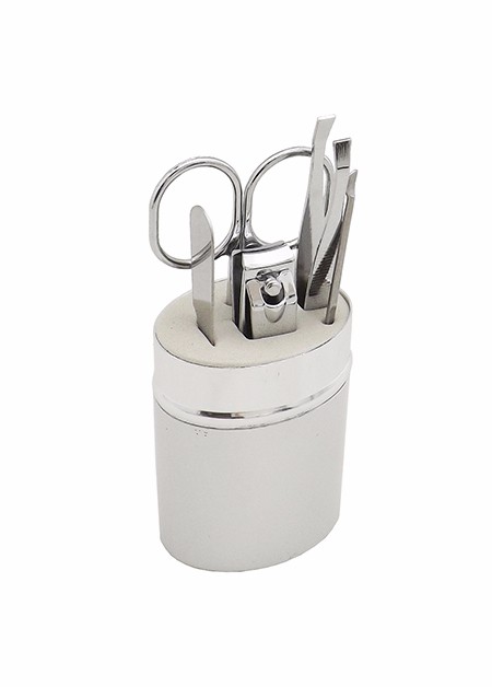 Kit em estojo oval de plástico. * Pinça * Tesoura * Cortador de unha * Lixa * Tira cravos Tamanho total do produto: (CxC) 12,0cm X 12,5cm Peso total do produto: 59g