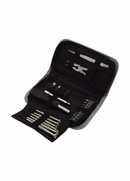 Kit ferramenta com 24 peças, estojo de Nylon. Embalagem, caixa de papelão resistente. Medidas para gravação (CxL): 8,5 cm x 15,8 cm Tamanho total (CxL): 9,8 cm x 17,7 cm Peso do produto: 426 g Peso do produto na embalagem: 463 g