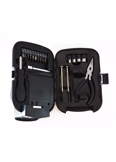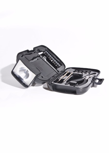 Kit ferramenta em estojo de plástico resistente com lanterna. Medidas para gravação (CxD): 7,0cm x 2,0cm Tamanho total (CxD): 20 x 15.5 x 11cm Peso do produto: 518 g