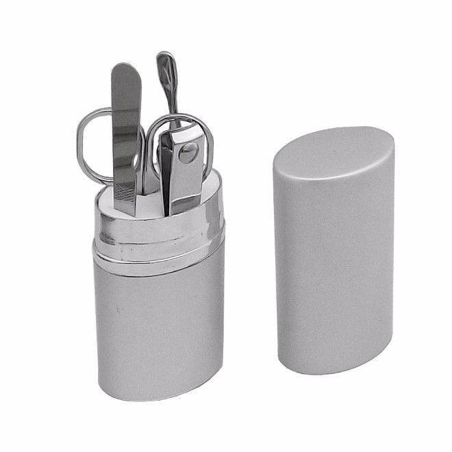 Kit manicure com 4 peças e estojo de alumínio. Contém: * 1 Cortador de unha, * 1 Tesourinha, * 1 Empurrador de cutícula, * 1 Lixa de unha, Tamanho total (CxL): 11,8 cm x 12 cm Peso do produto: 51 g