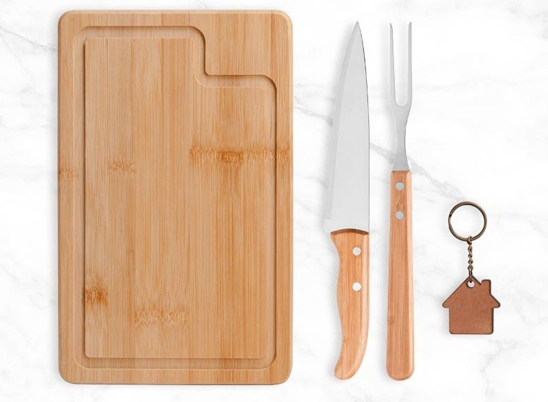 Uma gravação a Laser na tábua e na lâmina da faca.