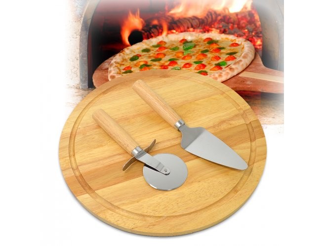 Kit pizza 2 peças, acompanha tábua. Cortador circular (C x L): 18,4 cm x 7,2 cm Espátula (C x L): 23 cm x 5,3 cm Tábua (C x L x E): 32,2 cm x 32,2 cm x 1,1 cm Peso sem embalagem: 0,741g Peso com embagalem: 0,919g