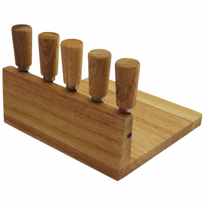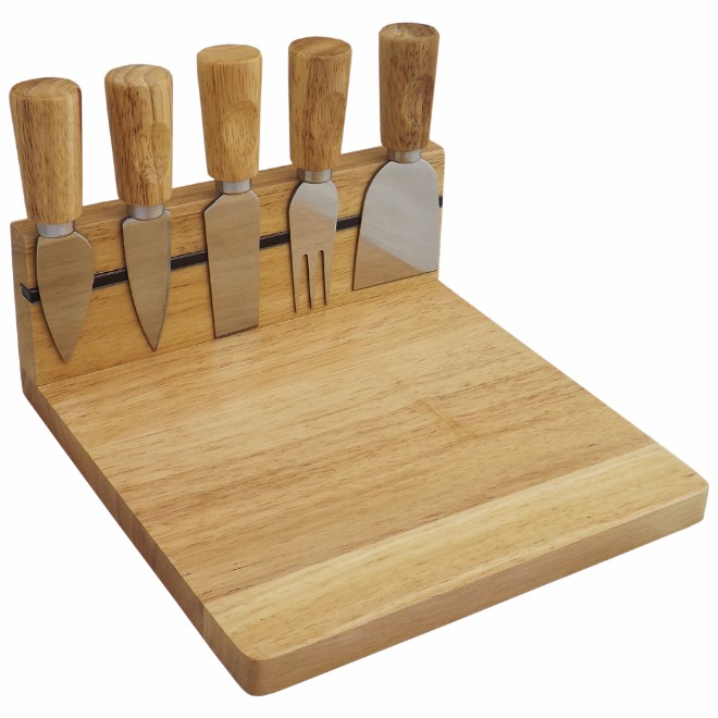 Kit queijo 6 pçs (base de madeira + 5 pçs) Medidas da base (CxLxE): 19,5 cm x 20,0 cm x 8,0 cm Peso do produto: 810 g Peso do produto na embalagem: 933 g