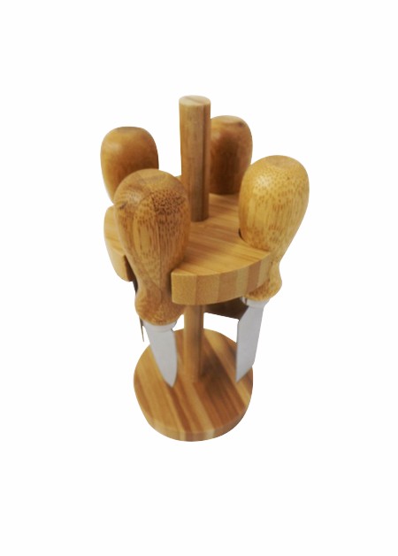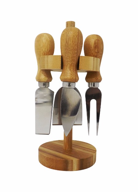Kit queijo com quatro talheres, com cabo e suporte de madeira. Medida total (CxL): 7,6 x 19.0 cm Peso total: 247 g