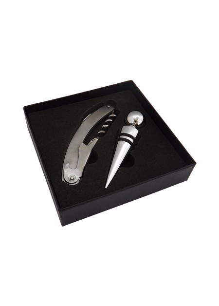 Kit vinho com 2 peças, estojo de papelão resistente. Conteúdo do kit: * 1 Saca rolhas * 1 Tampa de bico Tamanho total (CxLxE): 11,0 cm x 11,0 cm x 2,5 cm Peso do produto: 220 g