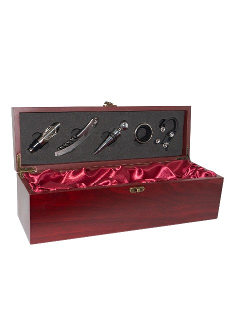 Kit vinho em estojo de madeira. * Tampa de vinho * Anel para Garrafa * Saca rolha * Cortador de tiras * Dosador de Vinho Tamanho total do produto: (CxL) 36,0cm X 11,5cm X 11,5cm Peso total do produto: 1052g