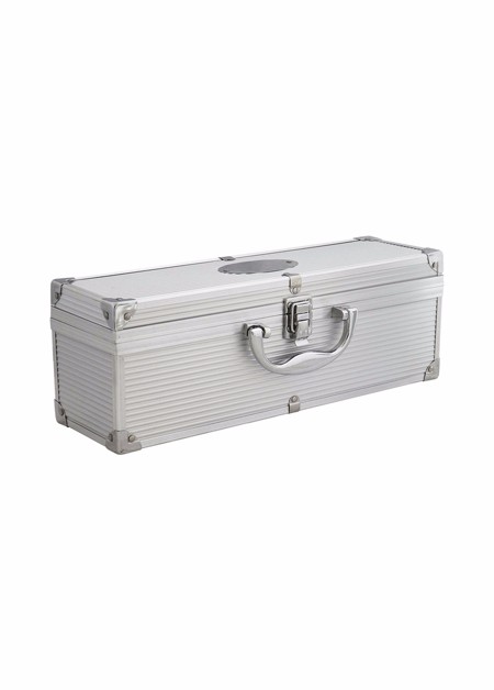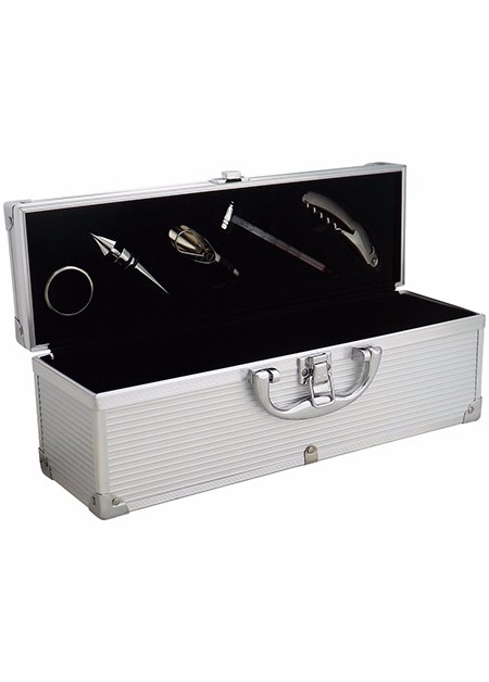 Kit vinho, guarda uma 1 garrafa com 5 peças, maleta de alumínio e Inox sem alça.