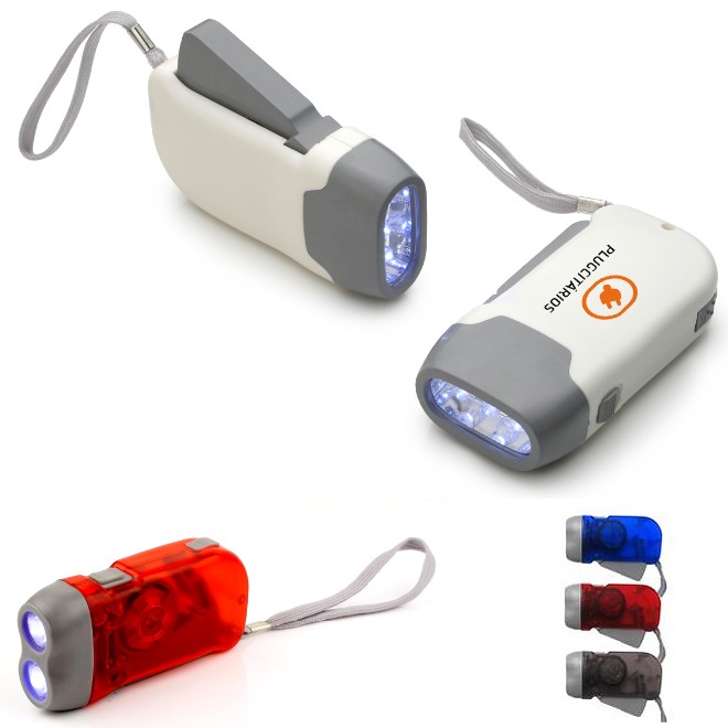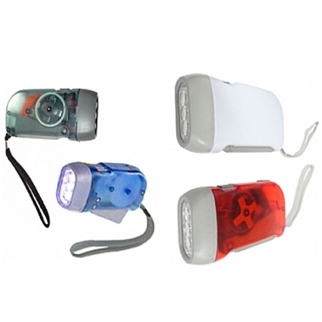 Lanterna de dínamo com 3 leds, material de plástico. Medidas para gravação (CxL): 3,5 cm x 7,0 cm Tamanho total (CxL): 5,0 cm x 9,7 cm Peso do produto: 69 g Peso do produto na embalagem: 79 g