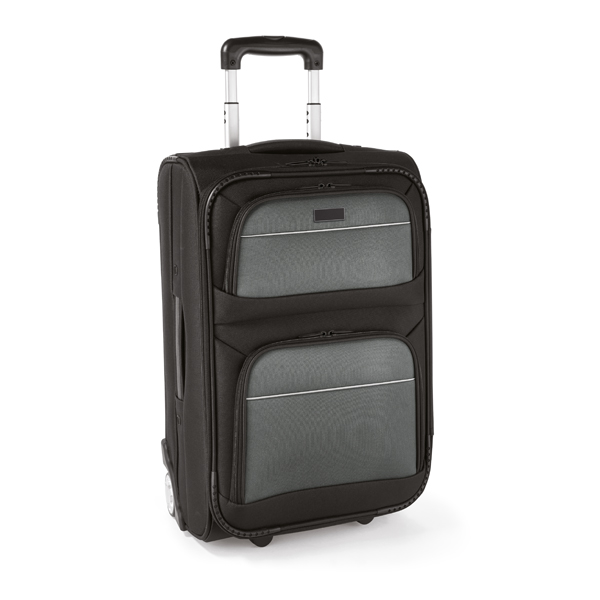 Mala de viagem. 600D e EVA. Com 2 rodas. 2 compartimentos frontais semi-rígidos e bolso interior. Interior forrado. Etiqueta para identificação na parte posterior. Pega extensível em alumínio, com mola (altura da pega estendida: 520 mm). Placa metálica removível com imã, para fácil gravação. Capacidade: 34 L. Peso: 2,90 kg. 360 x 530 x 215 mm | Placa: 50 x 20 mm