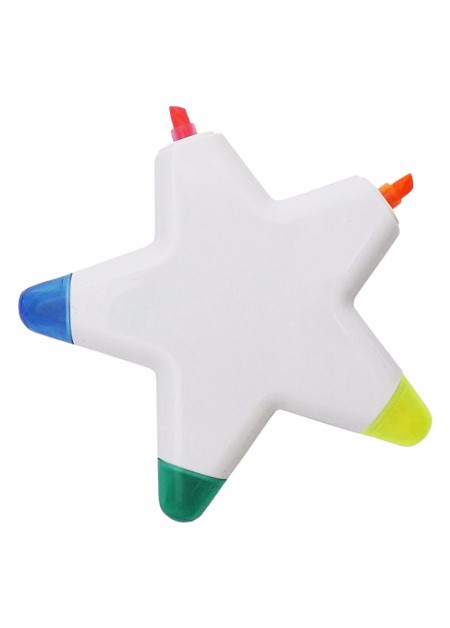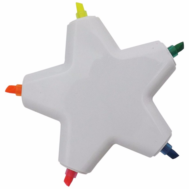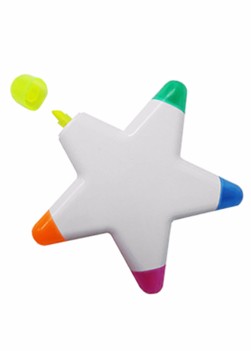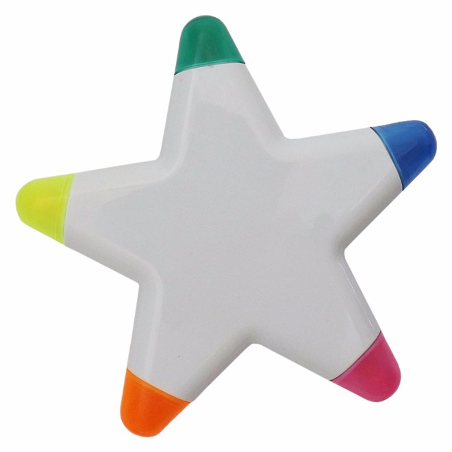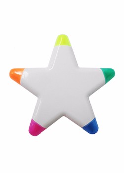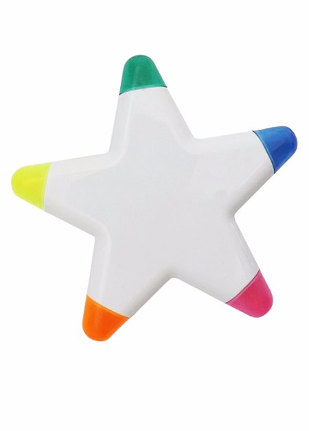 Marca Texto em formato de Estrela com 5 cores, material de plástico. Embalagem, saquinho plástico. Medidas para gravação (C): 3,5 cm x 3,5 cm Tamanho total (CxL): 9,5 cm x 9,5 cm Peso do produto: 27 g