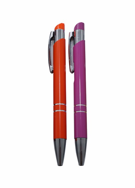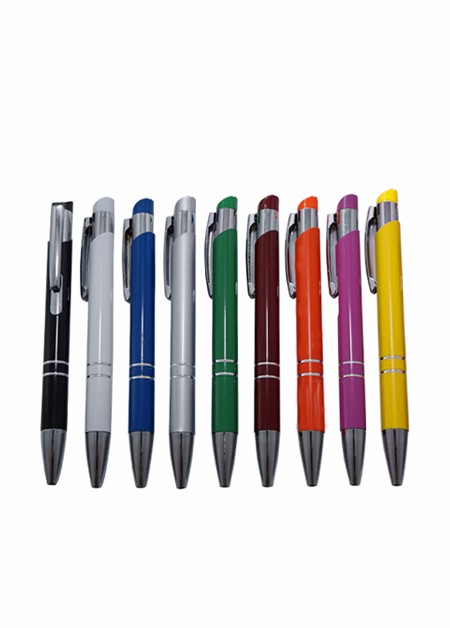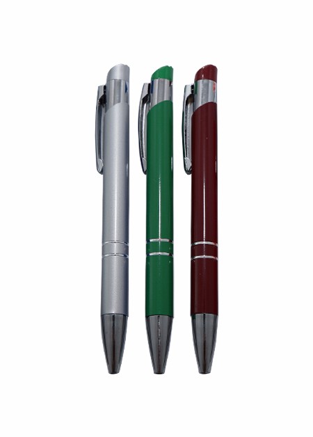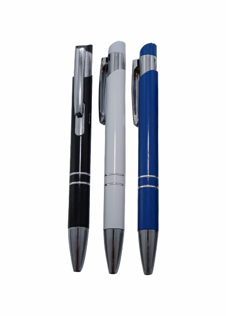 Mini caneta semi metal com detalhe de 3 anéis. Medida total (CxL): 11.9 x 3.8 cm Peso total: 11 g