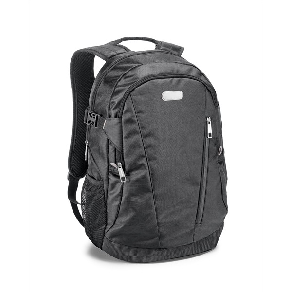 Mochila para notebook. 840D jacquard. Com 2 compartimentos. Compartimento posterior forrado, com divisória almofadada para notebook até 15.6''. Compartimento frontal forrado, com diversos bolsos interiores. Bolso lateral em tela e bolso frontal. Parte posterior almofadada, com sistema de apoio acolchoado para as costas e alças almofadadas. Placa metálica removível com imã, para fácil gravação. 305 x 470 x 180 mm | Placa: 50 x 20 mm