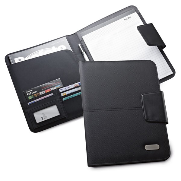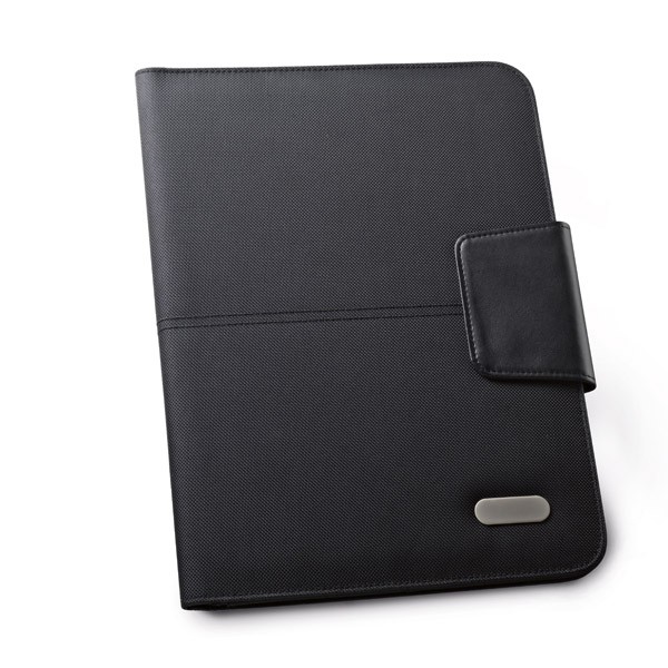 Pasta A4. C. sintético e 1680D. Fecho magnético. Bloco: 20 folhas pautadas. Esferográfica não inclusa. 245 x 325 x 15 mm | Chapa: 45 x 15 mm