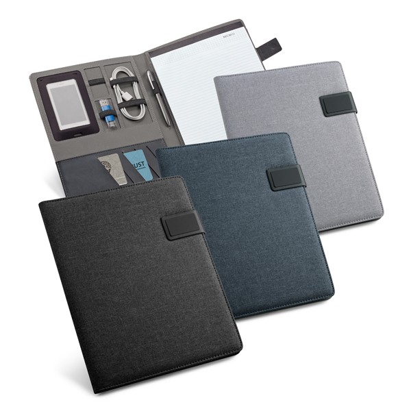 Pasta A4. Linho sintético e c. sintético. Fecho magnético. Bloco: 20 folhas pautadas. Placa metálica com acabamento emborrachado. Acessórios não inclusos. 233 x 310 x 18 mm | Placa: 50 x 30 mm