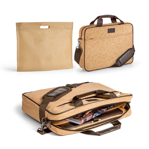 Pasta para notebook. Cortiça. Compartimento forrado e almofadado, com divisória almofadada para notebook até 15.6''. Bolso frontal. Alça de ombro ajustável, com reforço almofadado. Fornecida em embalagem de non-woven. 410 x 310 x 75 mm | Embalagem: 490 x 378 mm