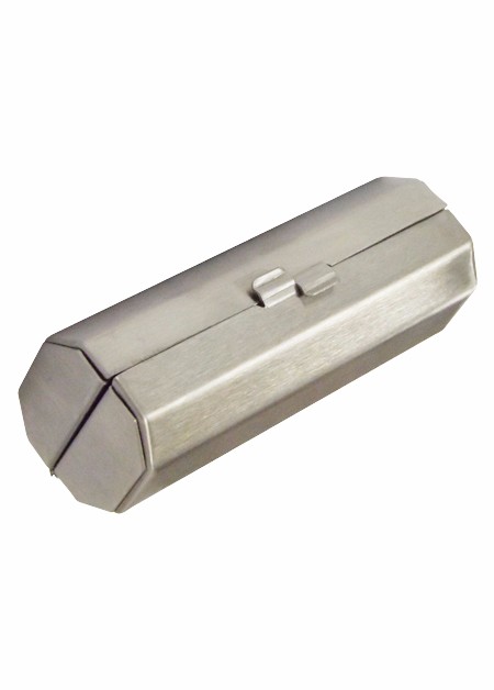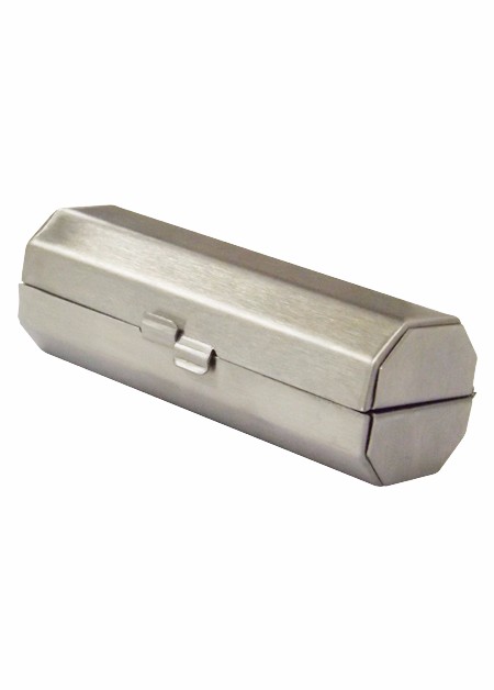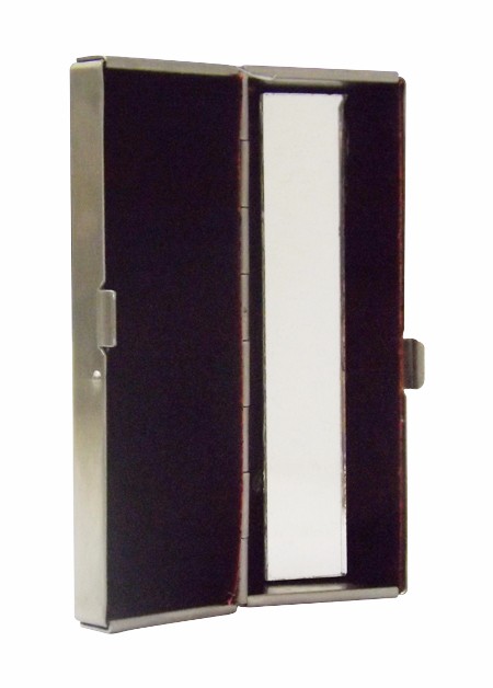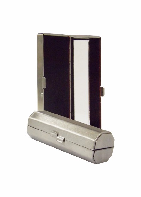 Porta batom em material Inox escovado, com espelho. Embalagem saquinho plástico. Medidas para gravação (CxL): 1,6 cm x 8,1 cm Tamanho total (CxL): 4,1 cm x 8,3 cm Peso do produto: 48 g