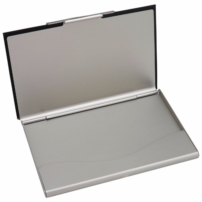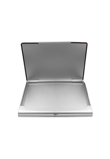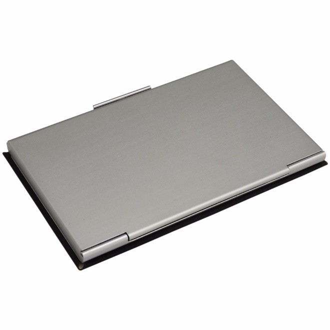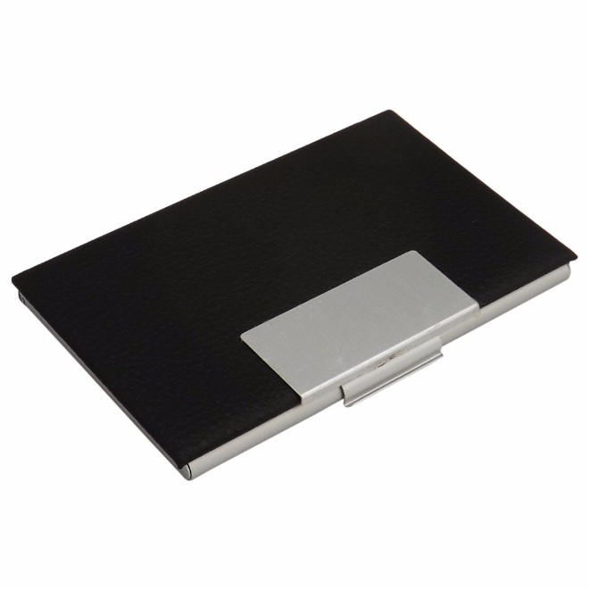 Porta cartão de bolso, de metal e couro sintético. Tamanho total (CxL): 13 cm x 10 cm Peso do produto: 40 g