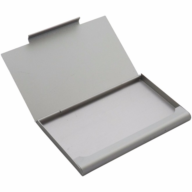 Porta cartão, material de alumínio. Embalagem, saquinho plástico. Medidas para gravação (CxL): 8,5 cm x 5,5 cm Tamanho total (CxL): 9,0 cm x 6,0 cm Peso do produto: 16 g