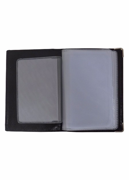 Porta documento de couro sintético, com cantoneira dourada, com capacidade para 8 cartões, disponivel nas cores whisky, café, preta, azul escuro e verde.