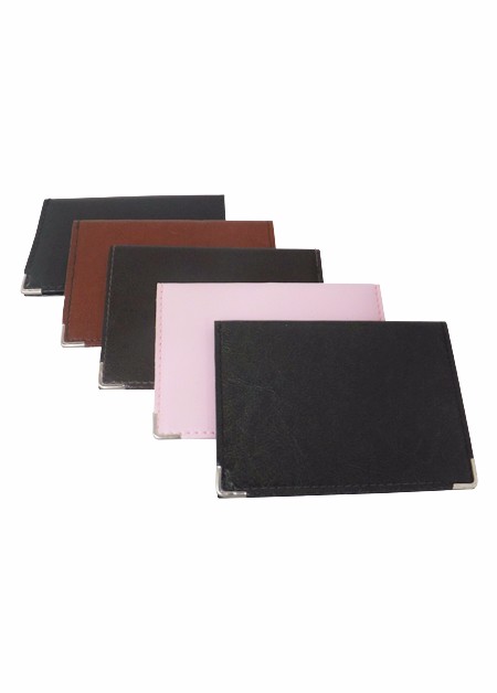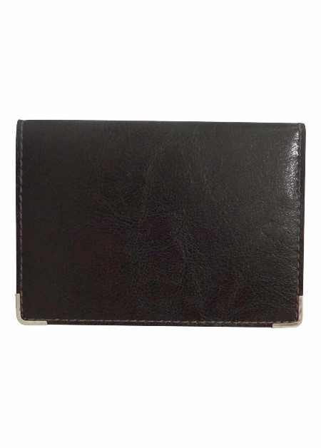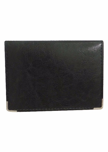 Porta documento de couro sintético, com cantoneira prateada, com capacidade para 8 cartões, disponivel nas cores whisky, café, preta, azul escuro e verde.