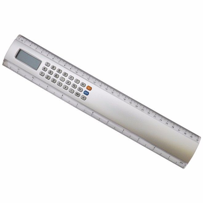 Régua de plástico de 30 cm com calculadora. Medidas para gravação (CxL): 3,3 cm x 17,2 cm Tamanho total (CxL): 5,5 cm x 31,0 cm Peso do produto: 91 g