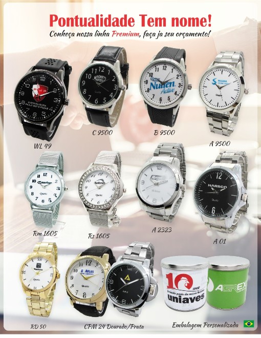 Relógios Pulso – Promocionais Personalizados. Pulseiras: Couro ou Metal. Modelos: Masculinos, Femininos e UNISSEX.