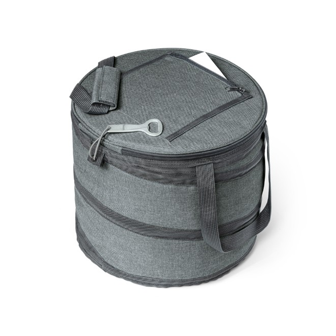 Sacola térmica flexível. 600D. Com zíper duplo, interior forrado com PEVA e abridor de garrafas. Bolso superior com zíper. Alças em webbing, com reforço. Capacidade até 15 L. Food grade. ø300 x 260 mm