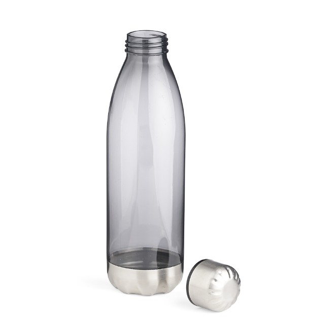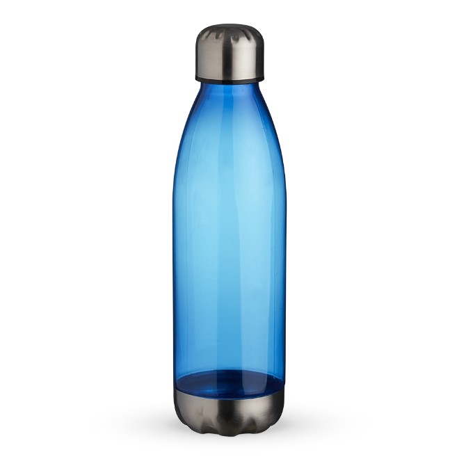 Descrição: Squeeze plástico 700ml formato garrafa. Corpo transparente colorido, possui tampa e base em alumínio.