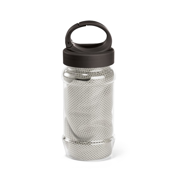 Toalha para esporte. Toalha: poliamida e poliéster. Garrafa: PP e PET. Toalha refrescante, quando molhada permanece fria durante horas. Se aquecer, basta balançar reativando sua frescura. Reutilizável e lavável à máquina. Garrafa com mosquetão inclusa (food grade). Capacidade até 440 ml. Toalha: 300 x 800 mm | Garrafa: ø65 x 125 mm