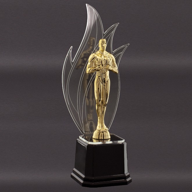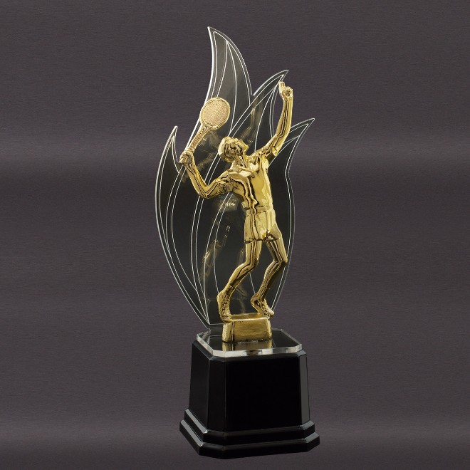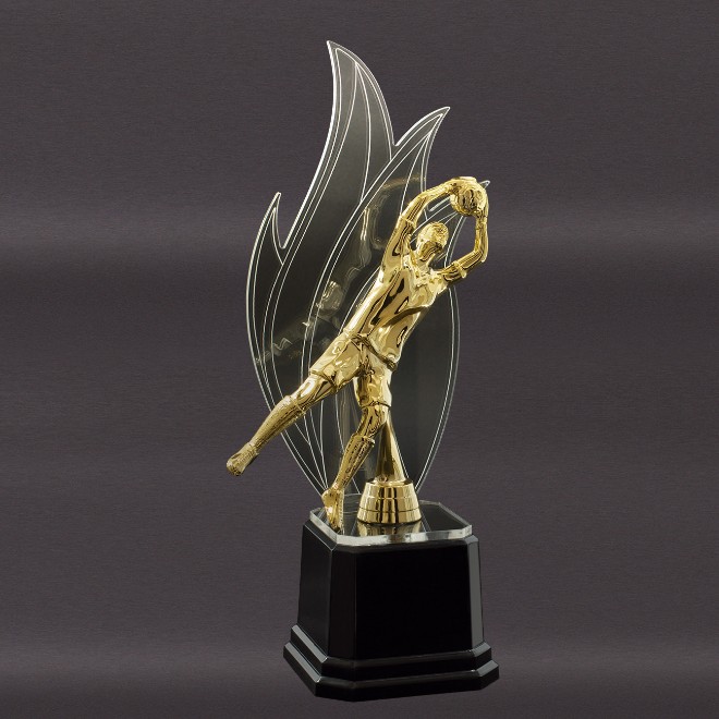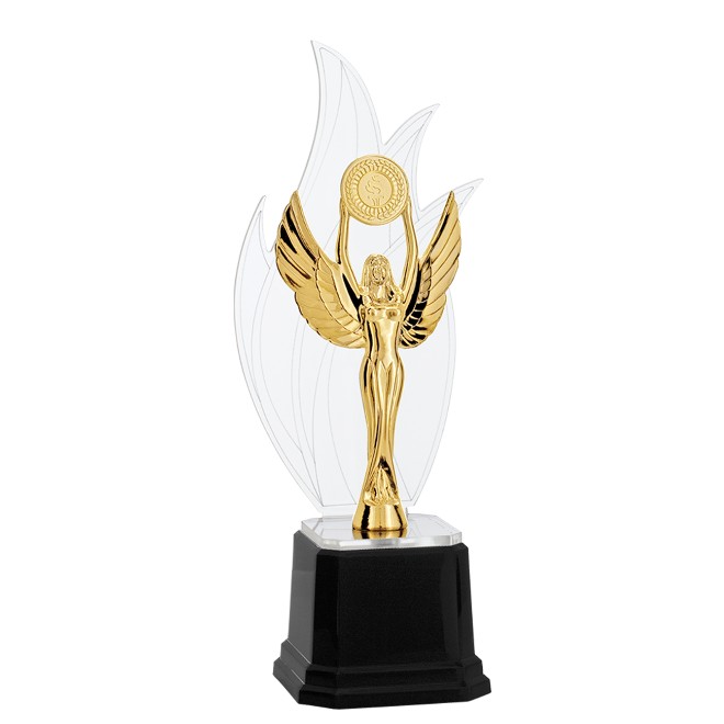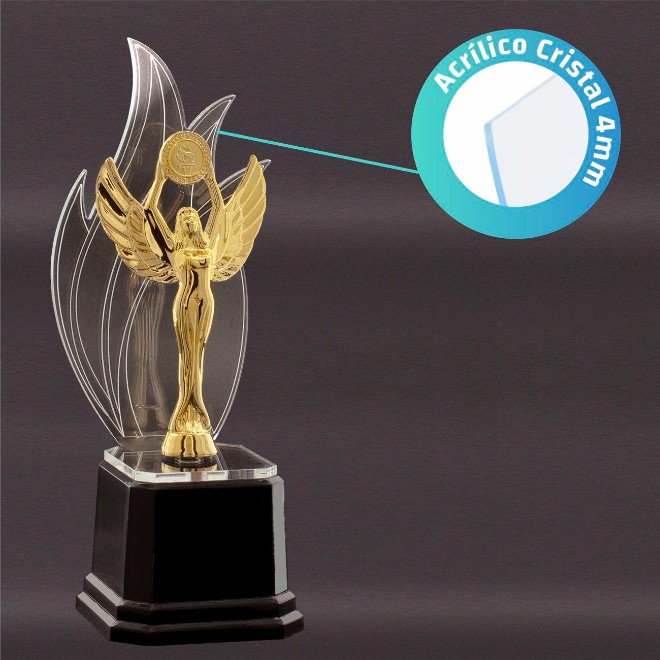Troféu com 24, 28 e 34 cm de altura, com base no formato oitavado em polímero na cor preta com largura de 10,1 cm, placa em acrílico transparente em formato de chama, com 25,5 cm de altura e acabamento riscado fixada por uma estatueta de deusa da vitória com 19,5 cm de altura, em polímero metalizado na cor dourada.