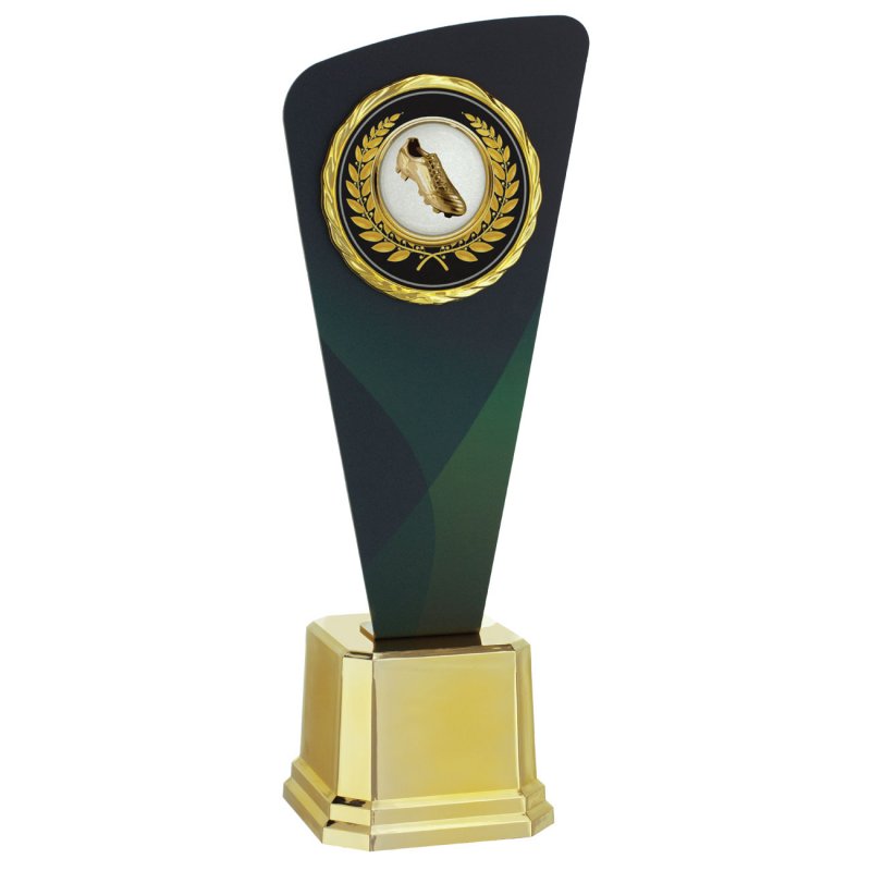 Troféu com 34, 39 e 43 cm de altura, base oitavada em polímero metalizado na cor dourada com 14,5 cm de largura, sobre esta base uma placa em metal adesivada na cor verde. Nesta placa está fixada um leito personalizável para adesivo de 106 mm, metalizado na cor dourada.